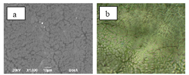 Figura 7: Imágenes de las películas de carragenina, con presencia de AgNPs; a) SEM; b) Estereoscopio 40X.