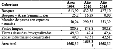 En las Figs. 1 a 3 se presenta la evolución del área de estudio frente a las diferentes coberturas vegetales. En su orden aparece: 1998, 2010 y 2015.
