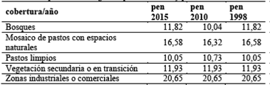 La ganadería ha causado grandes impactos ambientales, es por esto que Lorente [9], menciona que la ganadería como actividad humana, contribuye de manera muy relevante al cambio climático. En relación con ello, el sector agropecuario, al igual que la mayoría de las actividades humanas, viene determinado por el sistema económico actual, ya que si bien es cierto, este sector ha sido uno de los grandes causantes de los gases efecto invernadero y ha traído consigo grandes problemas de deterioro del suelo, también es cierto que se requiere de mejores procesos de planificación y rotación para una mayor disminución de los impactos ambientales generados. En la zona de estudio son evidentes los impactos ambientales generados por este sistema productivo, los cuales se traducen en el deterioro y erosión del suelo; sin embargo, no se observa ampliación de la frontera agropecuaria en los últimos años. De acuerdo con el análisis multitemporal, se muestra que en el año 1998 existían 880,3 ha de pastos limpios mientras que en el año 2015 se observan 802,8 ha; es decir, existe una disminución significativa en pastos limpios, por lo cual, a partir de 1998, se ha venido implementando procesos de restauración en el marco de la ordenación de la cuenca del río Chinchiná.