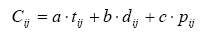 : coste de transporte entre i y j (distancia, tiempo o coste)