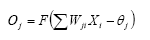 Se obtiene la salida de cada unidad, siendo determinadas directamente por la instancia presentada a la red. Para las unidades ocultas y de salidas el valor de la activación Oj estará estimada por (siendo F la función sigmoide):