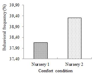 Based on the behavioral analysis, piglets from both nurseries remained less than 50% of their confinement period under comfort conditions, and Nursery 2 was more comfortable than Nursery 1.