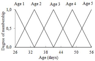 The input variable Age was adjusted as a function of the period of life of the animals during the experiment (26; 56); this interval was divided into five membership functions (Table 1).