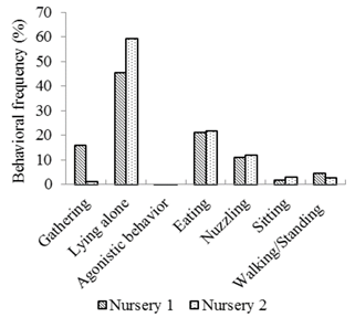 The behavioral frequencies of the piglets observed in Nurseries 1 and 2 are shown in Fig. 5. The frequencies of the gathering, lying alone, agonistic behavior, eating, nuzzling, sitting and walking/standing behaviors between the two nurseries were close. The gathering behavior was more frequent in Nursery 1, while lying was more common in Nursery 2.