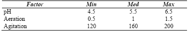 A Box Behnkenexperimental design of response surface was carried out to assess the influence of factors such as agitation, aeration, and pH in the concentration of biomass and exopolysaccharides. Values for each factor levels were selected based on those reported in the literature for the culture of this type of fungus. For agitation,a range from 120 to 200 rpm was evaluated; for aeration a range from 0.5 to 1.5 vvm; and pH between 4.5 and 6.5. Table 1 summarizes the operating conditions of the bioreactor used for carrying out the experimental design. Statistical analysis was performed using the software Design - Expert5®.