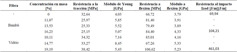 Las 15 probetas utilizadas para tracción y flexión corresponden a 5 muestras ensayadas para cada porcentaje de refuerzo. Las propiedades mecánicas se presentan en la Tabla 2.