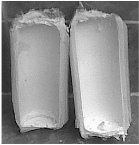 La microscopía de la Fig. 5 corresponde a micrografías en la superficie de falla de una probeta de ensayo de flexión con concentración de fibra de 16,23 % en masa donde se permite evidenciar la morfología de la fibra utilizada, coincidiendo con lo encontrado en la revisión bibliográfica [11]. Observando que cada fibra por separado posee pequeñas microfibrillas, lo que le proporciona una morfología hueca en su interior. Esta es una de las causas de su difícil manipulación cuando se pone en contacto con la resina fluida, ya que presenta una tendencia al hinchamiento por absorción.