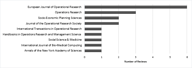 The scientific journals that published literature reviews related to the development of OR in the healthcare are shown in Fig. 2. In this list, the European Journal of Operational Research stands out for having the highest number of reviews. It is also important to underline that the rising levels of scientific contributions brings an upward trend in the number of specialized journals focused in the study of OR applied to health care.