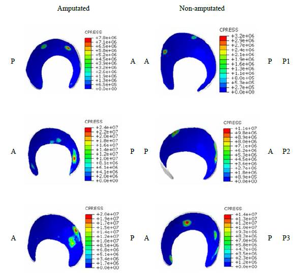 As expected, the main findings yielded some differences in the amputated and non-amputated side of each patient; however, changes to all the amputated and non-amputated sides were also observed in the contact mechanics (refer to Fig. 6.) These differences could be attributed to variations in bone and cartilage morphology [22,45], but other factors, such as stump and amputated femur longitudes, load directions, anatomical position of the patient and the distance covered by the socket upon positioning it, can also affect stress distribution. Nonetheless, it is normal for small regions to have concentrated stress while the rest of the zones have none. [21,22,24,25,27,28,44,46,47].