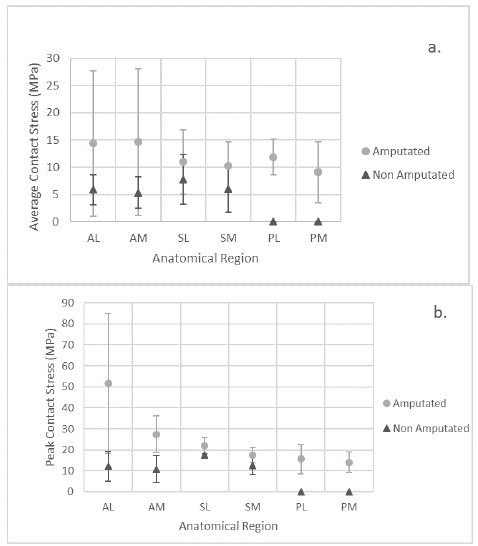 Stresses in the anterior region were the highest for the amputated side, while it was the superior region that registered the highest for the non-amputated one. However, both SL and SM were the regions with less variation in their stresses compared to the amputated one. Peak contact stress at the amputated side was higher than in the non-amputated side, Fig. 7, with the AL and the AM regions having the highest contact stresses. In contrast, it was the SL and the SM that had the highest contact stress in the non-amputated side.