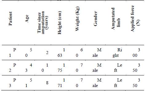 As the first approach to this kind of models, a standing position model will be used, since it is not only the easiest load case but one that can predict if there is a stress difference on various sides. Three patients that had undergone unilateral transfemoral amputation were selected; their specific data is presented in Table 1. The patients were relatively active and did not have any additional physical, vascular, neurological or psychological condition that could affect the result of this study. The patients used a non-distal end support socket, a solid ankle cushioned heel (SACH) foot, and a mechanical monocentric knee prosthesis. In accordance to the ethics committee of Universidad Nacional de Colombia, proper and informed consent was given by each patient before any of the procedures took place