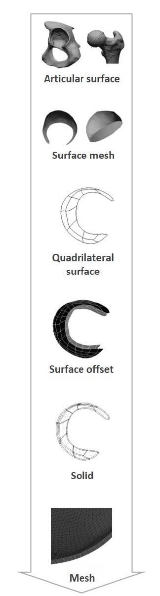 For both legs, the femoral and acetabular cartilages were obtained by expanding their respective articular surfaces by 1 mm, Fig. 1. This expansion was well within the values reported in literature, which is specified to be from 0,93 to 2,3 mm [34-37]. The meshes were constructed using as reference the quantity of the elements of similar studies [21,25,26,38]. The layers of the cartilages were constructed with hexahedral elements using the Salome - Meca software. The cortical bone, the stump and the socket were discretized with tetrahedral elements. The trabecular bone was not included in the process since it yields little significance in terms of contact stresses [24]. The general representation of the geometries can be seen in Fig. 2.