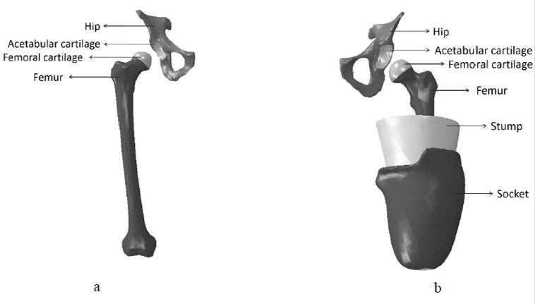 In existing literature, studies of lower limb amputation are related to gait dynamics [4-7], socket design [8] and socket - stump interaction numerical models [9-11]. In addition to these, joints studies are associated with osteoarthritis (OA) development in the knee [12-14] and the hip [14,15], the influence of different sockets on the range of motion of the hip [16] and the effect of osteointegrated prosthesis on the hip joint moment [17].