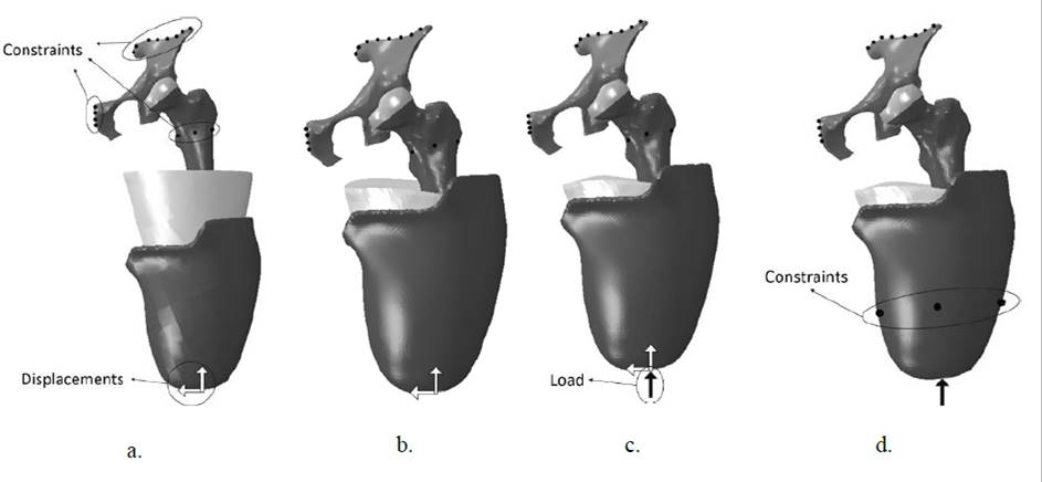Figure 3: Amputated model boundary conditions. a. Donning, b. Stabilization, c. Load, d. Contact