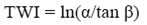Another approach to determine the extent of inundated areas was the topographic wetness index (TWI) eq. 1. Different topographic indexes area available to predict wetland distribution [33], based on the direction and accumulation of water flow derived from a digital elevation model (DEM). The TWI was calculated as the ratio of the slope (degrees) to the upslope of the contributing area.