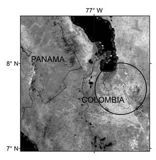 Figure 1: Wetlands associated with the Atrato River, León River floodplain located near the boundaries of Panamá and Colombia, South America. The background is a MODIS satellite image with 250 m spatial resolution.