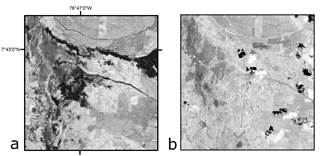 Satellite images were used to identify the marsh class, commonly occurring along rivers, ponds and lakes [28]. All satellite images of the Landsat program with world reference system (WRS) path 10 row 55 were evaluated. Satellite images have been found useful in tropical areas where fieldwork is not feasible owing to the harsh physical conditions [29]. Spatial distribution of inundated areas was determined making use of the temporal detection method of paired images [30, 31]: this method requires images of the same site, in this case after and before a flood in order to avoid confusion of flooded areas with other surfaces of similar reflectance as dark soils or shadows (Fig. 2). Visual interpretation of satellite imagery was preferred over fieldwork to delineate inundated areas because of the ephemeral nature of floods. The error here is related to the pixel size of 30 m of a Landsat image, commonly associated to a 1:100.000 map scale.