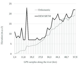 High per pixel values of TWI are related to large contributing areas and lower slopes, i.e., areas where surface runoff is likely to concentrate. The threshold to define the extent of TWI wetland pixels was defined by expert knowledge and regional topography. The area of candidate wetland pixels for this variable totals 218 km2, the quality of this result is a function of the level of detail and the relative elevation difference among pixels of the DEM. The SRTM input data for the TWI model was validated using GNSS RTK sub-metric measurements along the Leon River. Despite the pattern of the DEM depicting the general slope of the river flowing towards the sea, large elevations differences were found along the estuary, given the height of the forest along the borders, the spatial resolution of the DEM of 30 m (Fig. 3) and the difference between orthometric and WGS84 models.