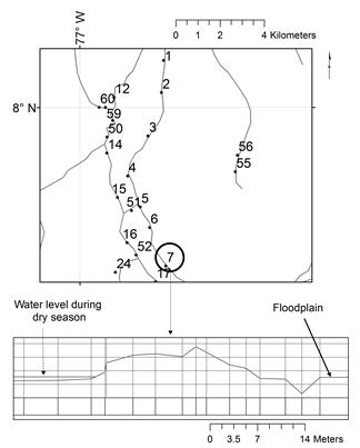 Two additional aspects regarding human-induced activities on surface hydrology were also considered: river diversion and non-natural levees. A total of 64 cross sections (sections normal to the direction of river flow) were located along an existing map of artificial levees; each cross section was georeferenced with a submetrical GPS. A total station was used to survey the geometry of each cross section, field work was carried out during the dry season in order to avoid flooding conditions.