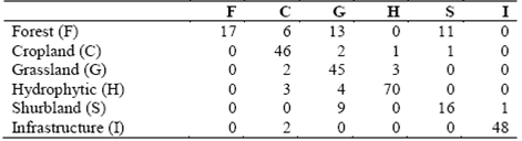 Table 2: Accuracy assessment of vegetation based on the matrix error. Reference data
