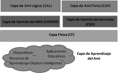 Este middleware, denominado AmICL, caracteriza un AmI de aprendizaje basado en C-Learning, usando un grupo de agentes, entre los cuales están: Agente Perfil de Estudiante (APE), Agente Tutor (AT), Agente Dispositivo (AD), Agente de Gestión de Servicios (AGS), y Agente Servicio (AS). Dicho Middleware fue propuesto en [4, 5], y es definido por seis capas (ver Fig. 1). La Capa Física (CF) representa los diversos dispositivos físicos del ambiente, definidos como agentes dispositivos en la Capa de gestión de AmI Físico (CAF). CF está conectada con el Sistema Operativo y trabajan en conjunto para realizar las diferentes actividades que se llevarán a cabo en el entorno. La Capa de Gestión del SMA (CGSMA) está compuesta por una comunidad de agentes que soporta la ejecución de aplicaciones multi-agentes. Esta capa ha sido especificada en artículos previos [4, 5] y se basa en el estándar FIPA ( Foundation for Intelligent Physical Agents, por sus siglas en inglés), organismo que establece estándares de software para agentes y define los elementos necesarios para que una sociedad de agentes pueda coexistir [8,15]. La Capa de Gestión de Servicios (CGS) es donde se registran, descubren, invocan, etc., los servicios requeridos por el ambiente en un momento determinado. La Capa de AmI Lógico (CAL) representa los diferentes componentes de software que son usados en la plataforma educativa. Adicionalmente, esta capa tiene dos agentes, el agente APE y el agente AT, que caracterizan a estudiantes y profesores, respectivamente. Finalmente, la capa de aprendizaje de AmI es donde se despliegan los diferentes dispositivos y herramientas de software del AmI de aprendizaje.