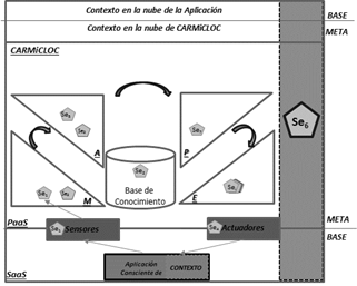 El diseño de CARMiCLOC se muestra en la Fig. 2, en donde se observan sus niveles Base y Meta de la computación reflexiva. Los puntos de enlace se encuentran entre estos niveles. En el Nivel meta se observa el Gerente Autonómico y la Base de Conocimiento, cada de uno de ellos está compuesto por uno o más servicios. CARMiCLOC define siete servicios para realizar la gestión del contexto, los servicios pueden prestarse de manera interna (I) (requerido por otros servicios de CARMiCLOC) o llamados independientemente por servicios externos (E). Además, los Servicios de CARMiCLOC pueden ser consumidos por Aplicaciones Conscientes del Contexto (ACC) o Aplicaciones No Conscientes del Contexto. Los servicios que ofrece CARMiCLOC son: Se1: Adquisición del Contexto y Pre configuración; Se2: Modelado del Contexto; Se3: Razonamiento del Contexto; Se4: Distribución del Contexto; Se5: Verificación y resolución de inconsistencia del Contexto; Se6: Seguridad y privacidad del contexto; Se7: Gestor de Servicios del Contexto. Los detalles de CARMiCLOC pueden encontrarse en [7].