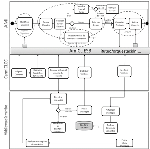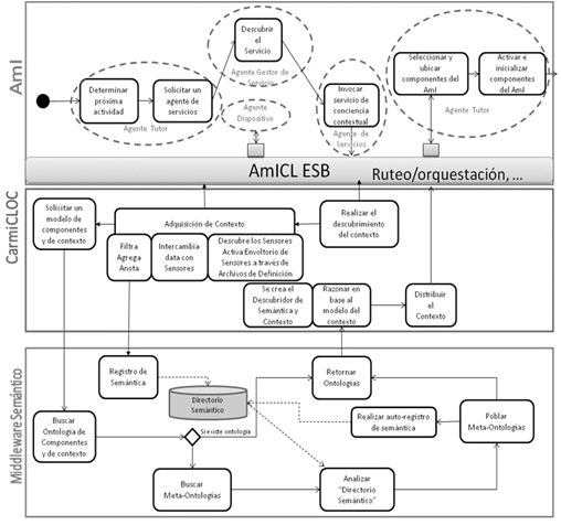 En consecuencia, AmICL es un Middleware Reflexivo Autonómico que permite la integración de los objetos (inteligentes o no) del ambiente educativo, con recursos educativos en la nube, de una manera flexible, proactiva y adaptativa, tal que estos objetos pueden ajustar su comportamiento de acuerdo al contexto y requerimientos del usuario, posibilitando ubicar, analizar y compartir el conocimiento. Todas estas características se logran en mayor o menor grado, al hacer uso de un servicio de consciencia contextual que cuente con un mecanismo que permita hacer emerger las ontologías de contexto, dominio, etc., de acuerdo con la situación del momento; es allí donde los middleware CARMiCLOC y Semántico hacen su trabajo.
