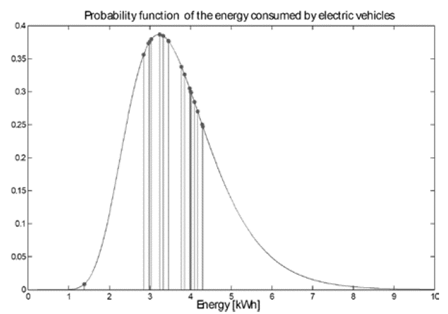Figure 9: Probability function of the energy consumed by electric vehicles connected to the distribution system between 16:00 and 22:00 hours.
