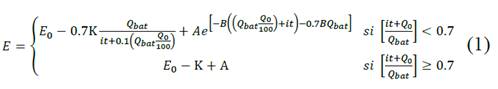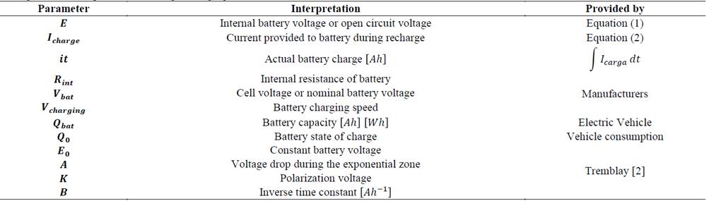 In order to identify the parameters in voltage and current equations, battery manufacturers show the characteristics for one cell. However, an electric vehicle battery consists of several cell arrangements; this involves determining the parameters of a particular battery based on a set of cells. To do this, the characteristics of a set of cells up to reach battery capacity and voltage are associated in [3]. Once the number of cells and their distribution are determined, other model parameters are calculated as described in [2]. In order to determine the parameters characterizing equations (1) and (2), values adopted in [3] are shown in Table 1 and used as a reference.