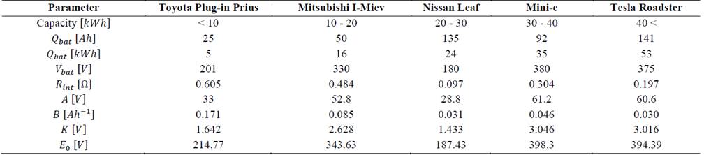 Table 2: Battery parameters of the most representative electric vehicles available in the market