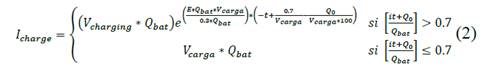 Likewise, as the selected method establishes, the behavior of the charging current of the battery would be opposite to the internal voltage, as shown in Fig. 3, exponentially decreasing to zero when it reaches 70% of charge, as shown in (2).