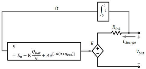 However, Shepherd wrote an equation to describe the electrochemical behavior of a battery in terms of terminal voltage, open circuit voltage, internal resistance, discharge current, and state of charge [17]. This model has been widely used, improved and even adopted in battery simulation as a generic element in Matlab/Simulink libraries [18]. One of the main modifications to the Shepherd model was to define a polarization voltage instead of a polarization resistance in order to remove the loops generated in Simulink. This model, proposed and validated by Tremblay [2] in electric vehicles, is used as a reference to describe the behavior of battery recharge during this research. The model consists of a dependent voltage source and a resistor in series, as shown in Fig. 1.