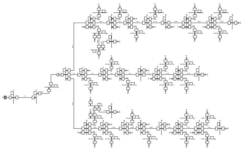 In order to develop this case study, a 56-nodes test system was selected; it has bus bars of 23 kV and a low voltage network of 415 V. The system has three low voltage feeders with 18 nodes representing residential users. It is assumed that each node has the same probability of one electric vehicle connected. This topology was taken from the study conducted by Deilami and Masoum [21] in order to compare obtained results; it can be seen in Fig. 5.