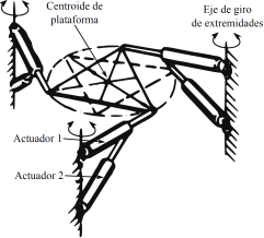 Un ejemplo de esta clase de estructuras fue patentada en 1928 por Gwinnett para ser empleada como una plataforma en un teatro de películas [11]. En 1947 Gough estableció los principios básicos de un mecanismo con una estructura de lazo cerrado que permite el posicionamiento y orientación de una plataforma móvil con miras a probar el desgaste de neumáticos (Fig. 2a) [12]. En este mecanismo, el efector en movimiento es una plataforma hexagonal en la cual todos sus vértices se conectan a un eslabón por medio de juntas de tipo rótula. El otro extremo de los eslabones se fija a la base mediante una junta universal. Un actuador lineal permite la modificación de la longitud total del eslabón; es una estructura con cinemática de lazo cerrado, accionada por seis actuadores lineales.