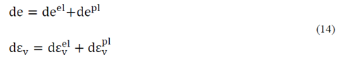 In incremental form, the deviatoric (de) and volumetric strain (dεv) terms are decomposed into an elastic and a plastic part as they are presented next.