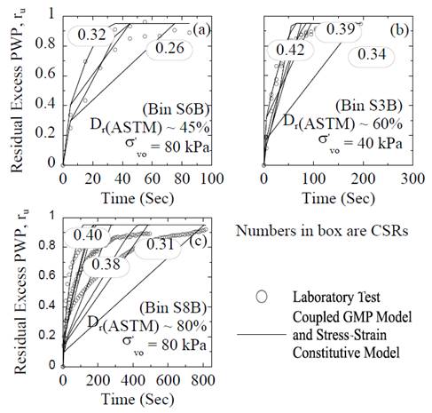 The authors used 12 cySS bins for the prediction exercise (Table 1). Model parameters for each of the models were determined using recommendation and formulation for that purpose. Figs. 1 - 3 compare the PWP time histories computed using the GMP model coupled with hyperbolic stress-strain, Elgamal and PM4SAND models to the measured responses of cySS tests in bins S3B, S6B, and S8B, respectively. In general, the GMP model coupled with hyperbolic stress-strain reasonably predict PWP generation in loose to medium-dense specimens (Fig. 1 (a) and (b), respectively). As expected, the model more poorly predict PWP generation in dense specimens (Fig. 1 (c) ). The Elgamal and PM4SAND models fairly predict PWP generation in loose to dense specimens (Figs. 2 through 3, respectively) for different CSR magnitudes (i.e., different FSliq).