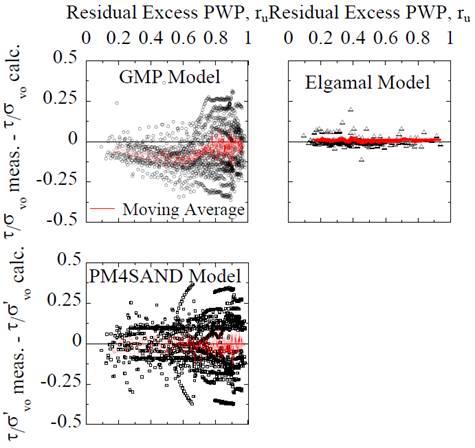 Fig. 4 presents the residuals for measured and predicted ru values (at each cycle) for the 12 cySS bins (25 individual cySS tests) in the prediction dataset. These data illustrate that the coupled GMP with stress-strain constitutive model yields small residuals (±0.25), but contain some bias. The Elgamal and PM4SAND models yield medium residuals (±0.5) with high bias concentrated in the underprediction side for Elgamal model and PM4SAND presents bias in the under and overprediction sides. However, all models qualitatively capture initial liquefaction.