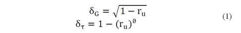 Building on the work by Hardin and Drnevich [24], Matasovic [9] proposed two degradation indices that introduce excess PWP-induced material softening into a simplified hyperbolic constitutive model. The modulus degradation index (δG) and stress degradation index (δτ) reduce the shear stress mobilized during the loading-unloading process as a result of PWP increase [9], and are defined as: