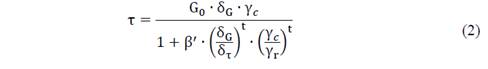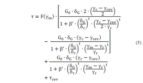 where γc = given shear strain; γrev = reversal shear strain; τrev = reversal shear stress; γm = maximum shear strain; γr = reference shear strain; t = dimensionless exponent; β' = dimensionless factor; δG = modulus degradation index; δτ = stress degradation index; F(γm) = reduction factor; and G0 = initial shear modulus.