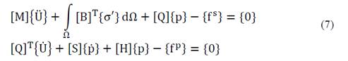 where [M] is the total mass matrix, {Ü} is the second derivative of displacement vector, [B]T the strain-displacement transposed matrix, {σ'} the effective stress tensor, Ω is the body volume, dΩ is derivative of the body volume, Q is the discrete gradient operator coupling the solid and fluid phases, [Q]T is the discrete transposed gradient operator coupling the solid and fluid phases, {p} is the pore pressure vector, [S] is the compressibility matrix, {0} is a cero vector, and [H] is the permeability matrix. The vectors {f s} and {f p} represent the effects of body forces and prescribed boundary conditions for the solid-fluid mixture and the fluid phase, respectively. Those Equations are integrated in the time domain using a single-step predictor multi-corrector scheme of the Newmark type [30,33].