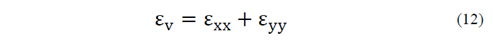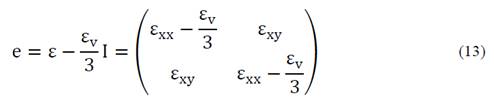 where εxx is the strain in the plane x, εyy is the strains in the plane y and the deviatoric strain tensor (e) is represented by: