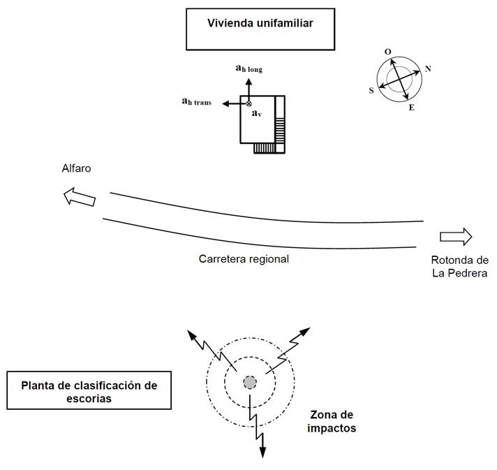 El funcionamiento de una planta de clasificación de escorias perteneciente a una acería, causa graves perjuicios constructivos sobre una vivienda unifamiliar, situada a unos 100 metros de distancia. La finalidad de la citada planta de clasificación, es el reciclado de las escorias de la acería, separando la chatarra de la escoria, para su posterior reutilización. Los trozos grandes se fracturan con ayuda de una grúa, dejando caer sobre los mismos -desde una altura de unos 20 metros- una bola metálica de grandes dimensiones, con el estruendo y las vibraciones inducidas que ello conlleva (Fig. 1).