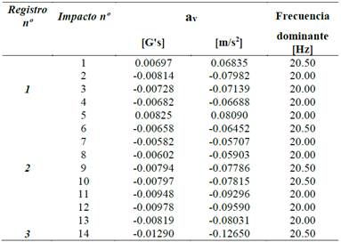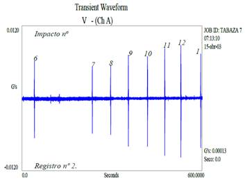 En la Tabla 1 se muestra un resumen de los resultados de varias mediciones, indicándose el número de registro y de impacto para cada uno de ellos, así como el valor pico de la amplitud vertical de la aceleración a v en términos de la aceleración de la gravedad terrestre en [g’s] y del sistema internacional de unidades en [m/s2], y la frecuencia dominante en [Hz], que aparece en el espectro de la señal vertical de la aceleración de cada uno de los impactos. A continuación, se representan los gráficos correspondientes a los dos últimos registros de la respuesta vertical, efectuados en día y hora diferentes, en el dominio del tiempo, en el primero de ellos (Fig. 4) se pueden apreciar claramente ocho impactos, mientras que el tercero (registro nº 3) presenta un único impacto -sin lugar a dudas de mayor magnitud-.