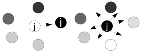 Figura 2: Movimiento de las luciérnagas según su atracción: (a) j se mueve hacia i, la luciérnaga más cercana a ella; (b) j tiene más brillo que cualquiera de las otras luciérnagas por lo que se mueve aleatoriamente.