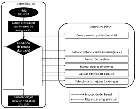 En la Fig. 3 podemos observar un diagrama del GPU-DFA. Al inicio del GPU-DFA todos los parámetros son transferidos a la memoria principal de la GPU. Adaptar este tipo de algoritmo bioinspirado no es una tarea sencilla puesto que la gestión de la memoria en la GPU debe ser cuidadosamente manejada. La transferencia de datos entre CPU y GPU puede producir cuellos de botella y se busca minimizarla en nuestra propuesta. Utilizamos un grupo de kernels donde realizamos las siguientes tareas: primero, el GPU-DFA crea y evalúa cada luciérnaga de la población P usando un hilo (thread) de la GPU para generar cada solución. A continuación, hasta que no se alcance la condición de terminación, el GPU-DFA ejecuta una serie de kernels para evaluar en paralelo si cada luciérnaga i se moverá a otra luciérnaga j y posteriormente generar una población de n mejores luciérnagas. La división en múltiples kernels se debe a la heterogeneidad y complejidad de las tareas. Así, las operaciones costosas son ejecutadas principalmente en la GPU.