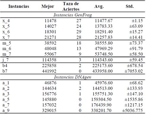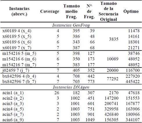 Para nuestro estudio se llevaron a cabo experimentos con diferentes instancias del DNA-FAP [23]. Las mismas se pueden diferenciar en dos grupos, el primero de ellos ha sido generado mediante el uso de GenFrag [7] y para el segundo se ha utilizado el programa DNAgen. La Tabla 1 resume las instancias estudiadas, sus nombres, cubrimiento, tamaño (número de fragmentos por instancia), tamaño de la secuencia original y el óptimo para cada una de ellas. Las instancias están ordenadas por grupo y número de fragmentos.