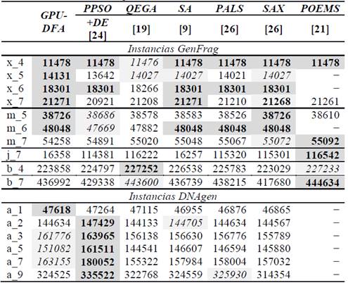 Tabla 2: Resultados del GPU-DFA para las instancias del DNA-FAP.