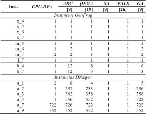 La Tabla 4 presenta los valores contigs de todas las instancias para cada algoritmo. La columna uno muestra el nombre abreviado de la instancia. Desde la columna dos a la columna siete se muestran los valores contigs de los siguientes algoritmos: GPU-DFA, Colonia de Abejas Artificiales (Artificial Bee Colony, [9]), QEGA, SA, PALS y GA [9].