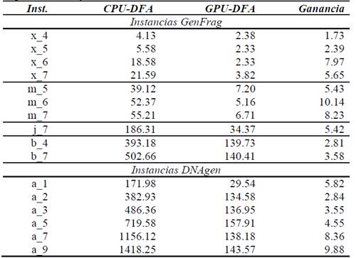 En la Tabla 5 se muestra el tiempo promedio consumido en segundos para las versiones en CPU y en GPU del DFA. En la primera columna se informa el nombre abreviado de cada instancia. La columna dos y tres indican los tiempos de ejecución promedio consumidos por el CPU-DFA y el GPU-DFA respectivamente. Finalmente, la columna cuatro muestra la ganancia de tiempo obtenida.