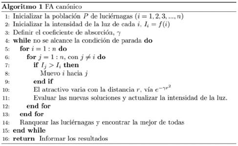 La distancia entre dos luciérnagas i y j ubicadas en diferentes locaciones puede ser expresada por la distancia Euclideana. Teniendo en cuenta r, β e I, el algoritmo es capaz de definir el movimiento de una luciérnaga i con respecto a otra luciérnaga j. El pseudo-código del FA canónico puede observarse en el Algoritmo 1. Primero, la población P de luciérnagas es inicializada (línea 1). Se inicializa la intensidad de la luz para cada luciérnaga i con el valor de aptitud (línea 2). Luego, se define el valor del parámetro γ (línea 3). Mientras la condición de parada no se alcance (línea 4), para cada luciérnaga i, el algoritmo tratará de encontrar una luciérnaga j más brillante, cercana a i (líneas 5 a 13). El algoritmo compara entonces I j e I i , si 𝐼 𝑗 > 𝐼 𝑖 entonces la luciérnaga j se moverá hacía i (línea 8). El movimiento de una luciérnaga i atraída por otra más atractiva j se calcula siguiendo la eq. (3).
